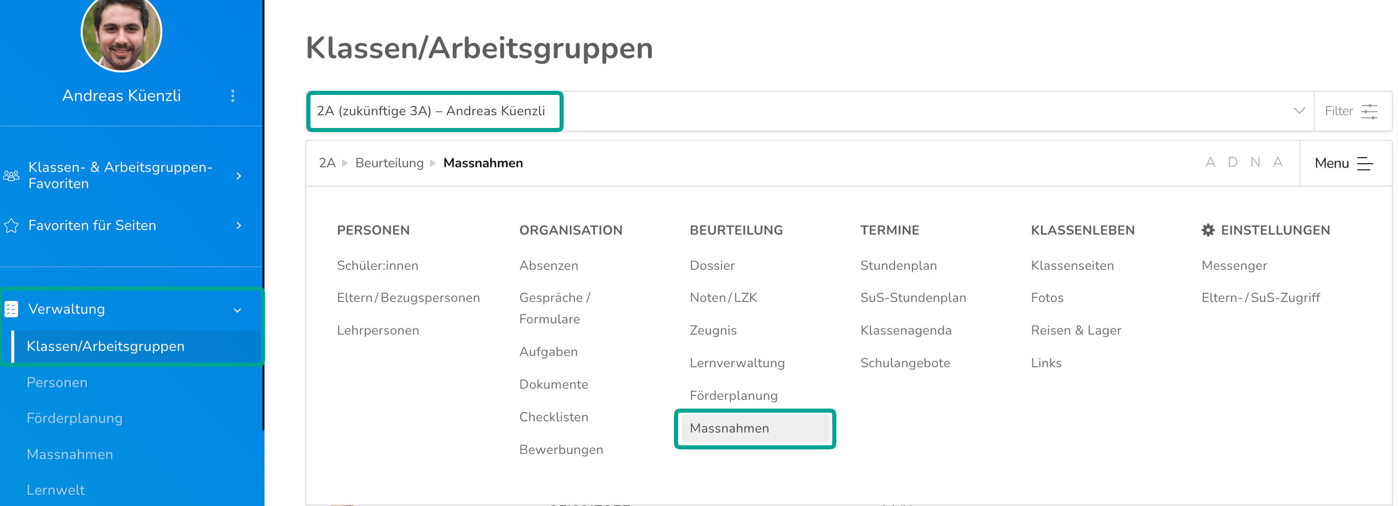 Über Verwaltung >Klassen/Arbeitsgruppen kann man die Massnahmen der Schüler:innen einer spezifischen Klasse aufrufen. Wähle dafür die entsprechende Klasse aus und klicke im zweiten Menü auf Massnahmen.