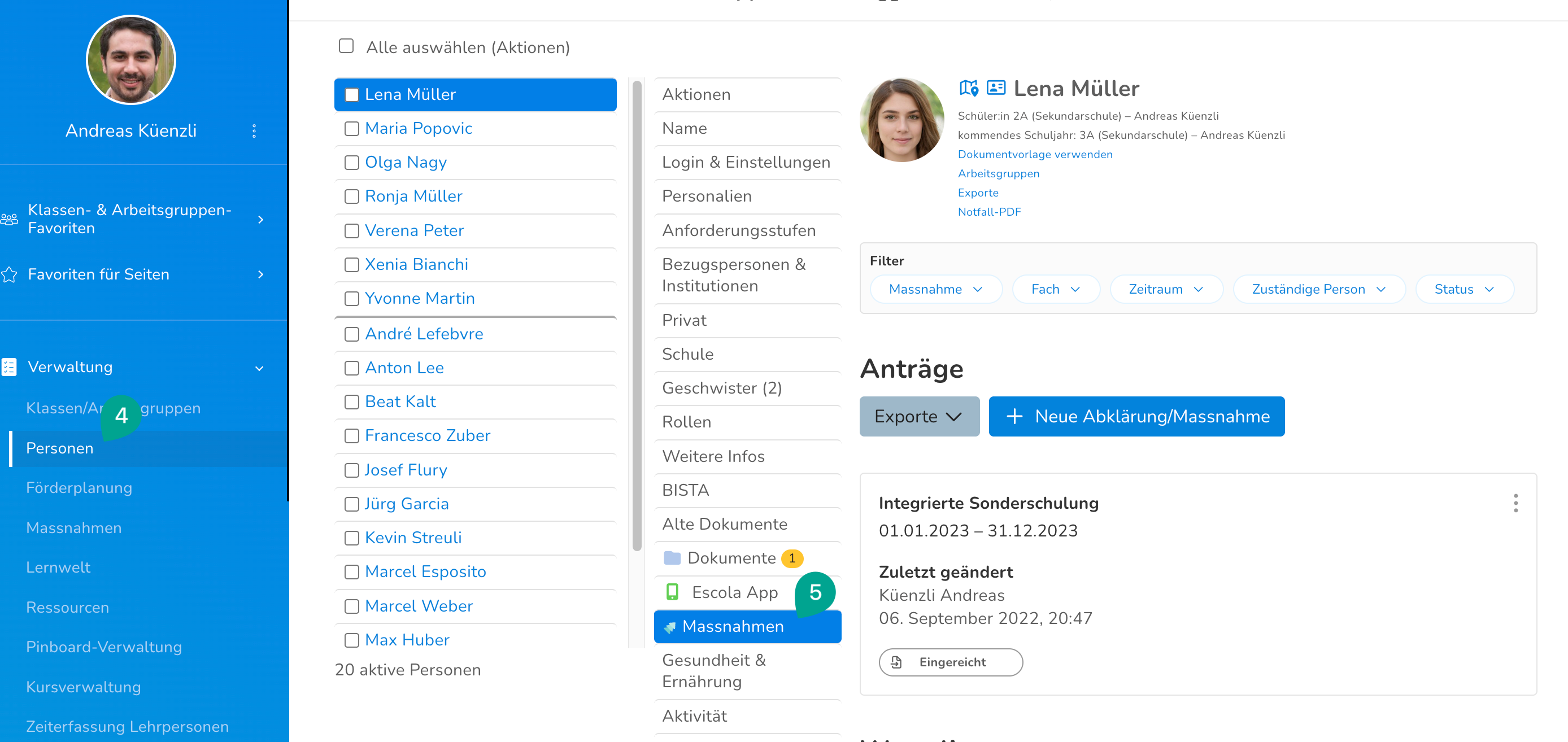 Um die Massnahmen einer einzelnen Schüler:in aufzurufen, kann man unter Verwaltung>Personen (4) die entsprechende Person suchen und das Register "Massnahmen" (5) öffnen. Dann werden einem rechts die Massnahmen der Schüler:in angezeigt.