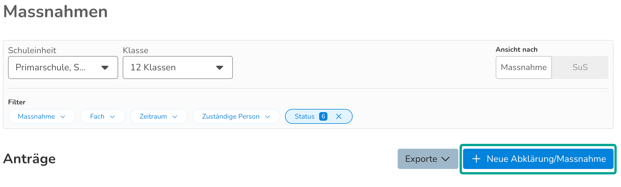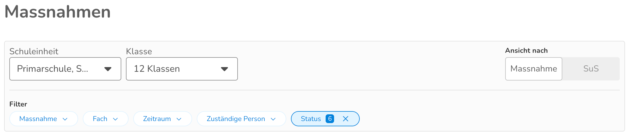 In der Übersicht stehen verschiedene Filter zur Verfügung. Man kann sich die Massnahmen pro Schuleinheit, Klasse, Massnahmenart, Fach, Zeitraum, zuständiger Person oder Status anzeigen lassen. Ausserdem können sie nach Massnahmen oder nach Schüler:innen sortiert dargestellt werden. Bei der Sortierung nach Massnahmen werden oben die ausstehenden Massnahmenanträge, danach die Massnahmen, die auf einer Warteliste stehen und zuletzt die Massnahmen, deren Anträge bereits bearbeitet wurden, angezeigt.