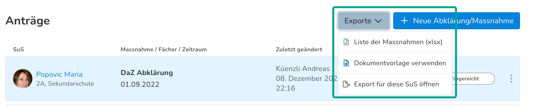 Über "Export" können die Massnahmen als Excel-Liste heruntergeladen werden. Wenn deine Schule mit Dokumentenvorlagen arbeitet, kannst du über den "Export"-Knopf auch auf die Vorlagen zugreifen, die für den Bereich Massnahmen hinterlegt sind.