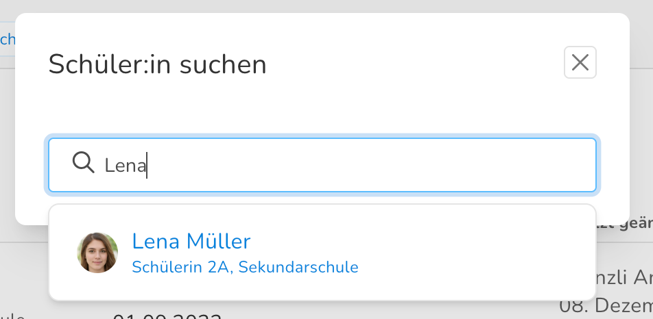 Suche die Schüler:in aus, für die die Massnahme erstellt werden soll. Wenn du in der Förderplanung bereits eine Schülerin oder einen Schüler selektiert hast oder in der Personenverwaltung über eine Schülerin oder einen Schüler die Massnahmen aufgerufen hast, entfällt dieser Schritt.