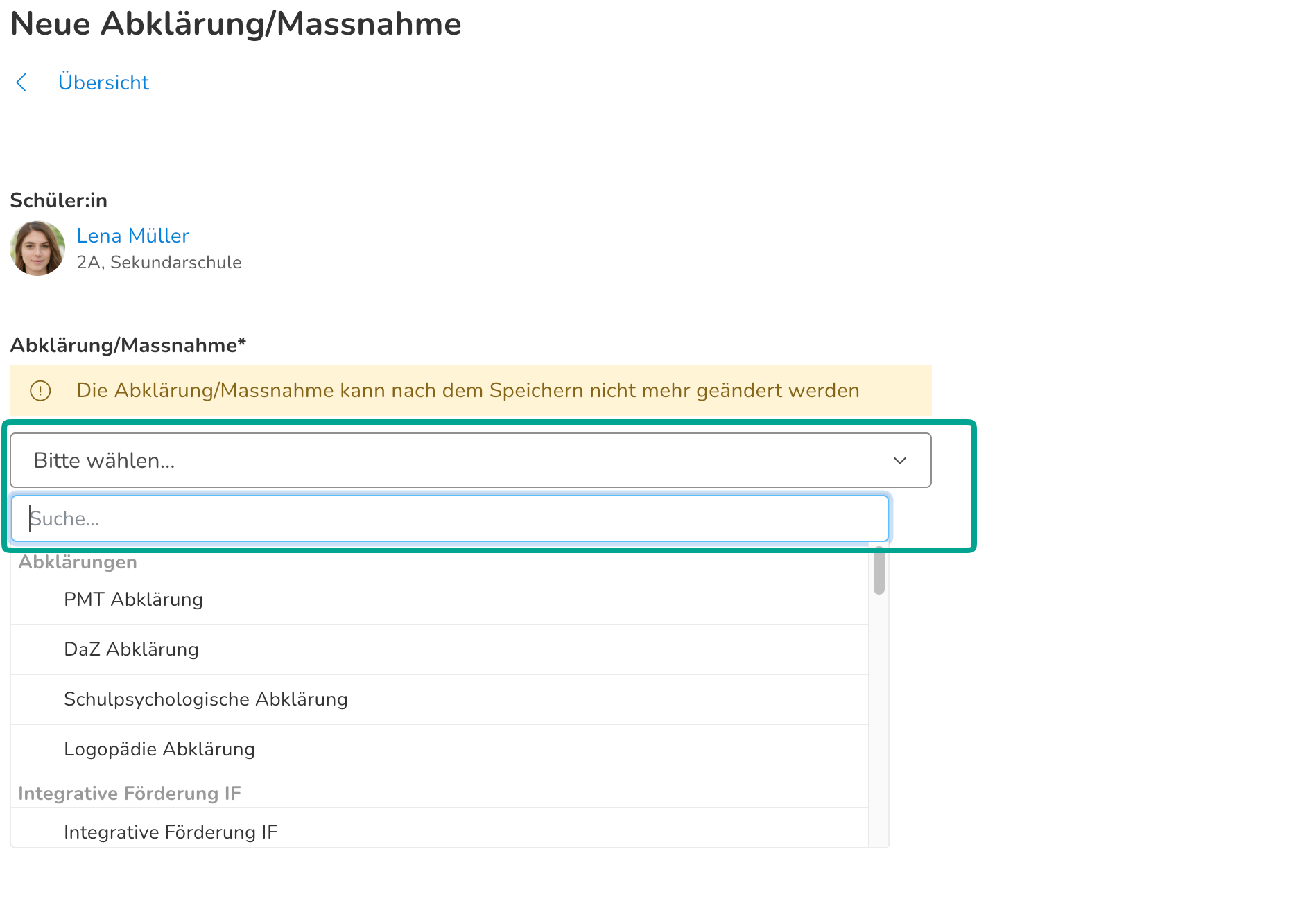 Nun kannst du über ein Drop-Down die entsprechende Massnahme oder Abklärung auswählen. Bei jeder Schule ist die Auswahl an Massnahmen individuell konfiguriert, weshalb bei deiner Schule eine andere Auswahl zur Verfügung steht. Für jede Schüler:in kann eine Massnahmenart jeweils nur einmal beantragt werden. Erst wenn eine Massnahme umgesetzt und abgeschlossen ist, kann dieselbe Massnahmenart für diese Schüler:in wieder beantragt werden.