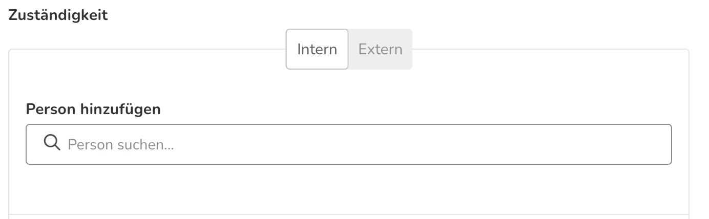 Zuständigkeit: Die Zuständigkeit definiert, welche Person die Umsetzung der Massnahme übernimmt. Hierbei kann unter "intern" Personen innerhalb von Escola ausgewählt werden. Unter "extern" können Personen erfasst werden, die nicht auf Escola angelegt sind. Es kann zudem eine Bemerkung ergänzt werden.