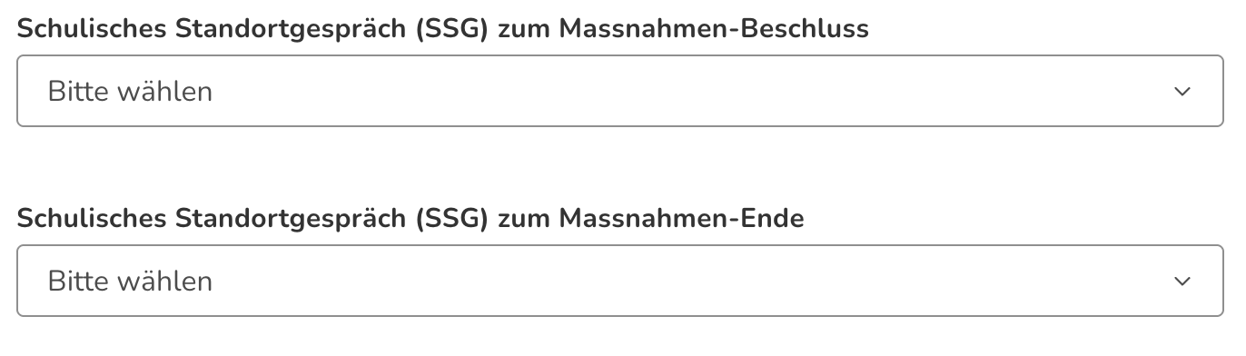 Es öffnet sich ein Formular, das je nach Massnahmen- bzw. Abklärungsart unterschiedliche Felder beinhaltet. Zum Teil werden von Schulen Hilfstexte zu den Feldern hinterlegt, die weitere Hinweise darauf geben, wie die Felder ausgefüllt werden sollen. Sie werden jeweils in einer blauen Box angezeigt. Die Felder werden im Folgenden beschrieben: