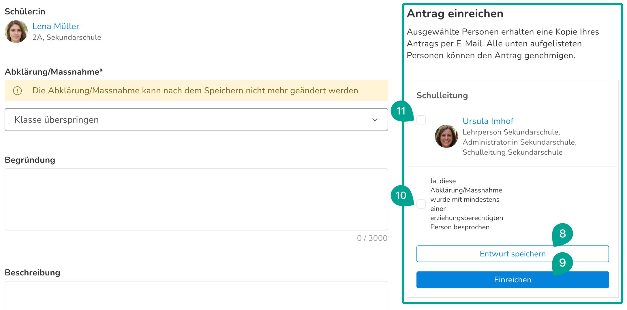 Oder der Massnahmenantrag kann eingereicht (9) werden. Dafür muss bestätigt werden, dass die Abklärung oder Massnahme mit einer erziehungsberechtigten Person (10) besprochen wurde. Ausserdem muss angewählt werden, bei welcher Person der Antrag eingereicht (11) werden soll. Alle angegebenen Personen können den Antrag genehmigen oder ablehnen, aber mindestens eine Person davon wird zusätzlich per E-Mail über den Antrag benachrichtigt.