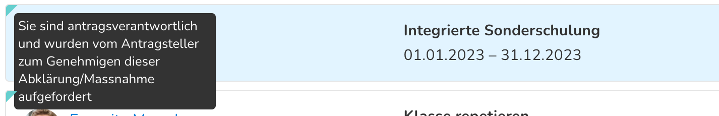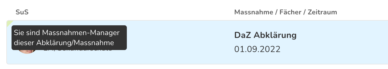 In der Massnahmenübersicht zeigt dir ein kleines farbiges Eck in der Massnahme an, ob du für eine Massnahme verantwortlich bist. Fahre mit der Maus darüber, um dir deine Verantwortung anzeigen zu lassen.