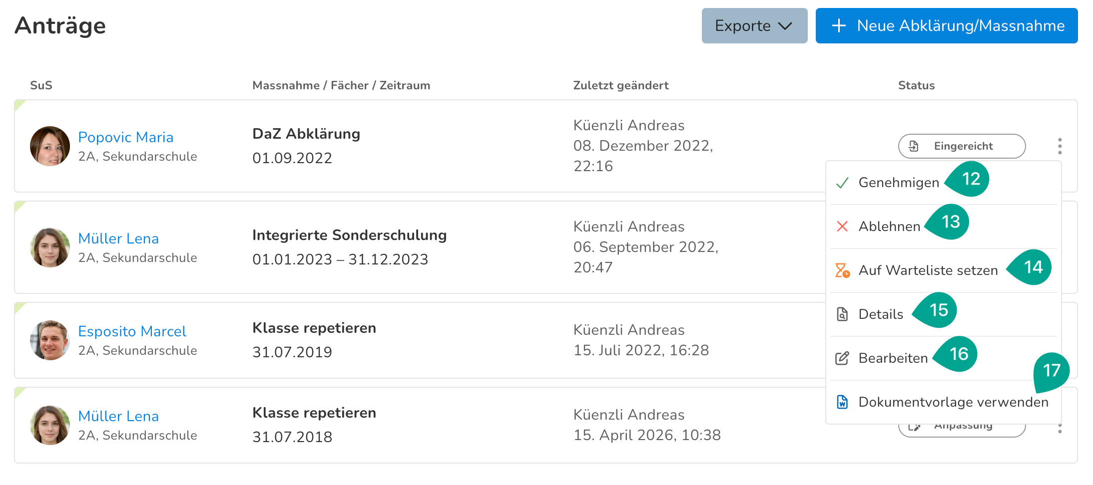 Um Massnahmenanträge zu bearbeiten, klicke auf die drei Pünktchen auf der rechten Seite.
