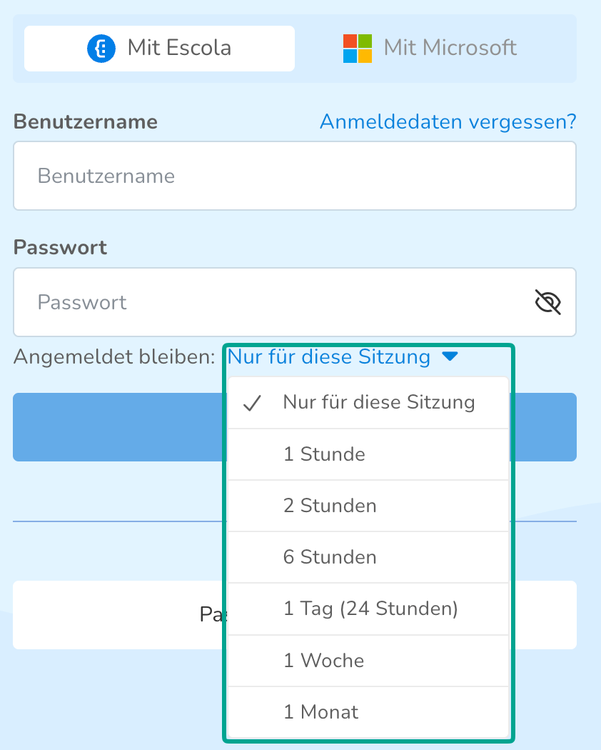 Beim Login kannst du die Option "Angemeldet bleiben" aktivieren. Damit wird deine Sitzung gespeichert und du bleibst je nach gewählter Einstellung angemeldet, ohne dich erneut einloggen zu müssen. Du kannst dabei auswählen von "nur für die Sitzungsdauer" bis zu "1 Monat".