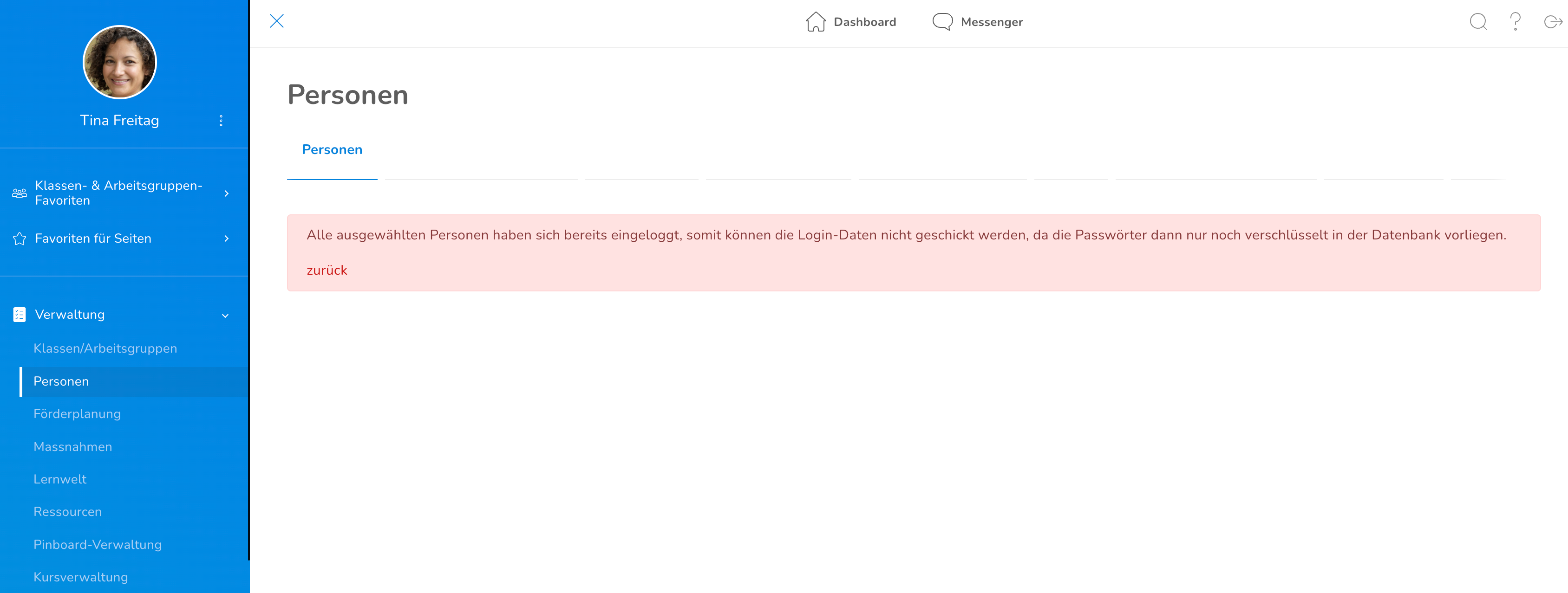 Eine Übersicht über die bereits versendeten Logindaten gibt es nicht. Möchte man jemandem jedoch die Logindaten zustellen, obwohl die Person die Daten bereits erhalten hat, erhält man eine entsprechende Meldung.