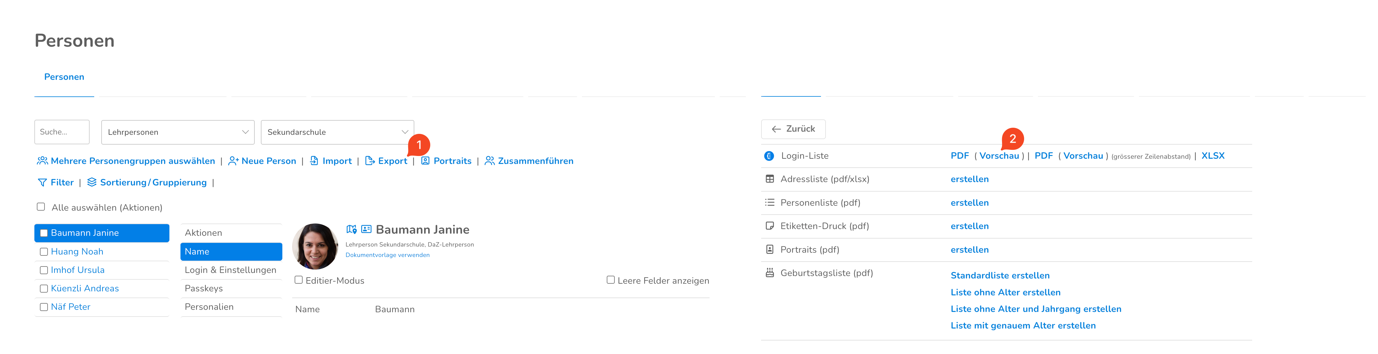 - Wähle die gewünschte Personengruppe aus und klicke anschliessend auf Export (4). Nun kannst du die Login-Liste (5) exportieren.