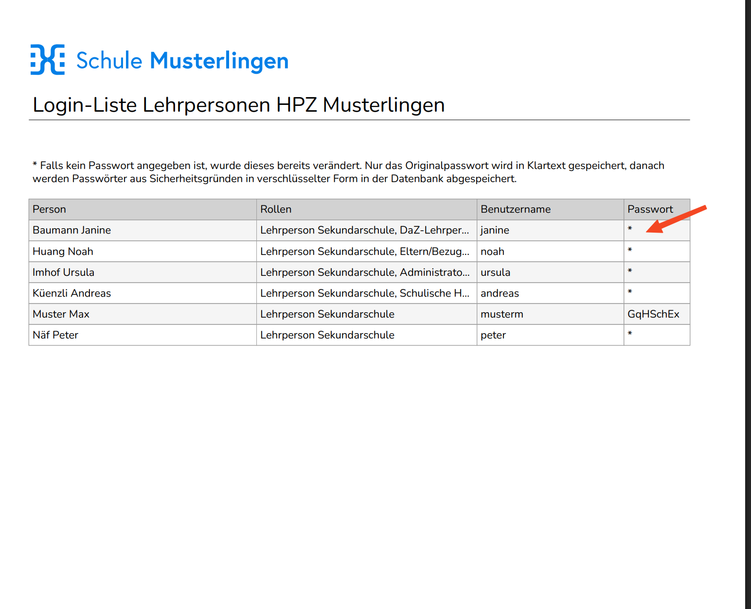 Wichtig: Beide oben genannten Methoden sind nur nutzbar, wenn die Person das Passwort noch nicht geändert hat. Nur Initial-Passwörter werden in Klartext gespeichert. Nach einer Änderung ist das Passwort nur noch verschlüsselt in der Datenbank hinterlegt.